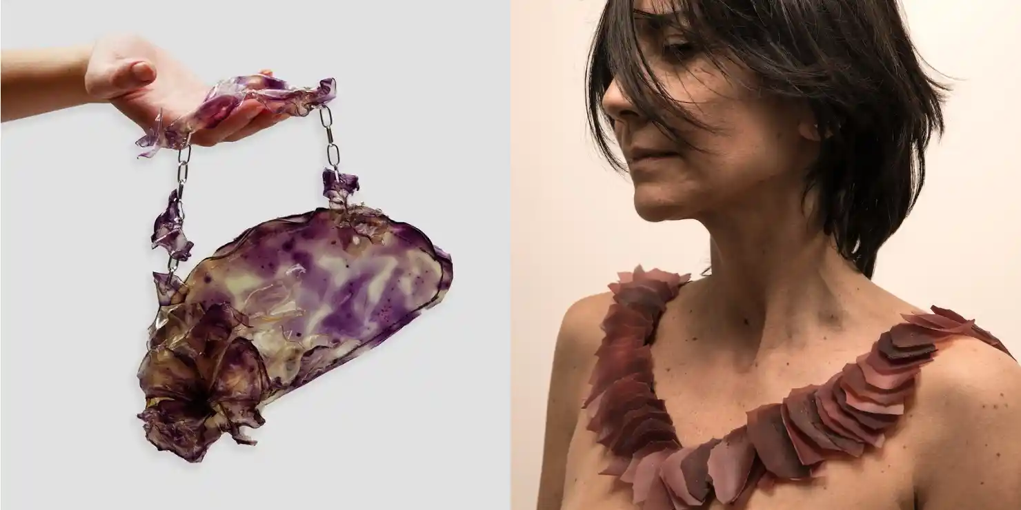 La muestra propone un recorrido por piezas elaboradas con materiales vivos o regenerativos —hongos, frutas, kombucha, fibras vegetales— que desafían los límites entre arte, ciencia y artesanía. Lámparas de micelio, carteras de mango o nopal, cuencos de palta y collares de mandarinas forman parte del conjunto de obras que exploran nuevas formas de creación más respetuosas con el ambiente.